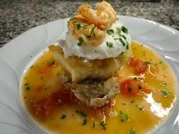 Ahora vamos a montar el plato. Colocamos una rebanada de pan y sobre ella el huevo. A su lado se coloca un trozo de pollo con la salsa y encima el cangrejo de río. A veces también se montan los ingredientes uno encima de otro.
